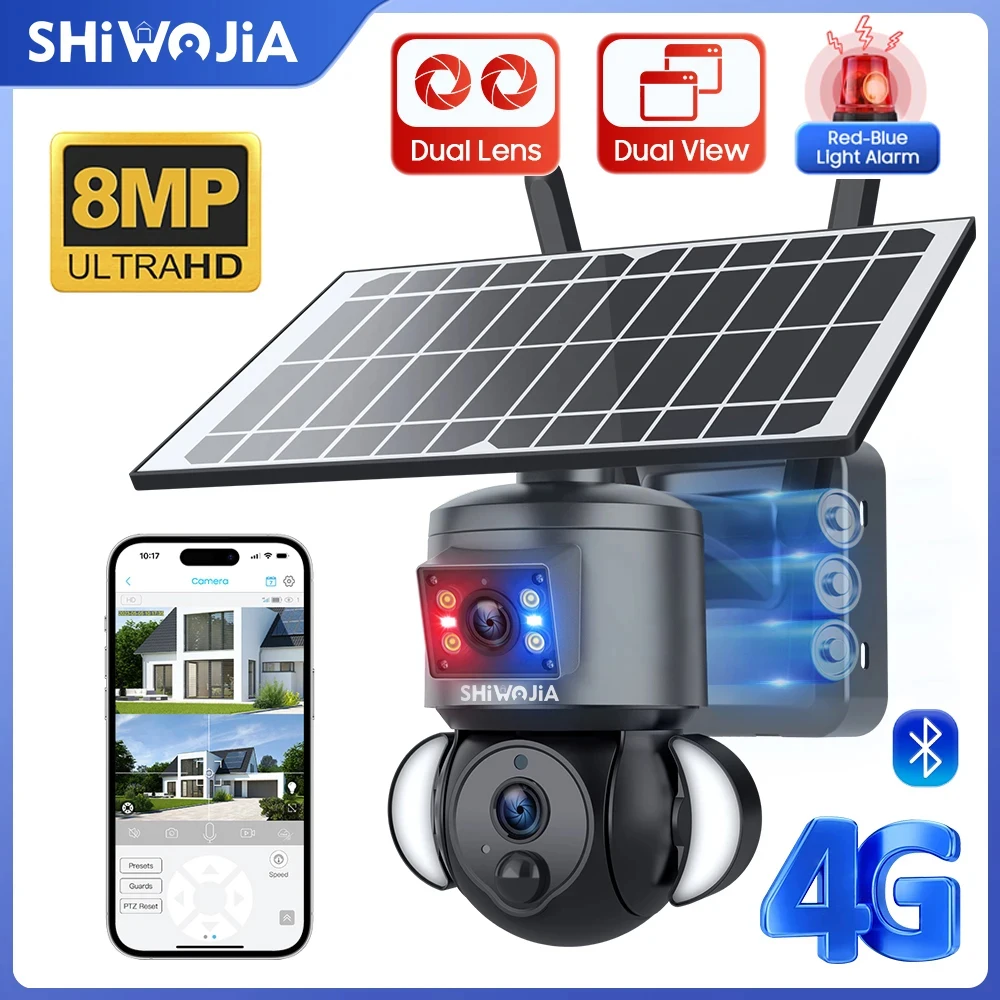 SHIWOJIA 4K 8MP caméra solaire 4G SIM/WIFI sécurité extérieure double lentille enregistrement suivi humanoïde couleur Vision nocturne caméra PTZ