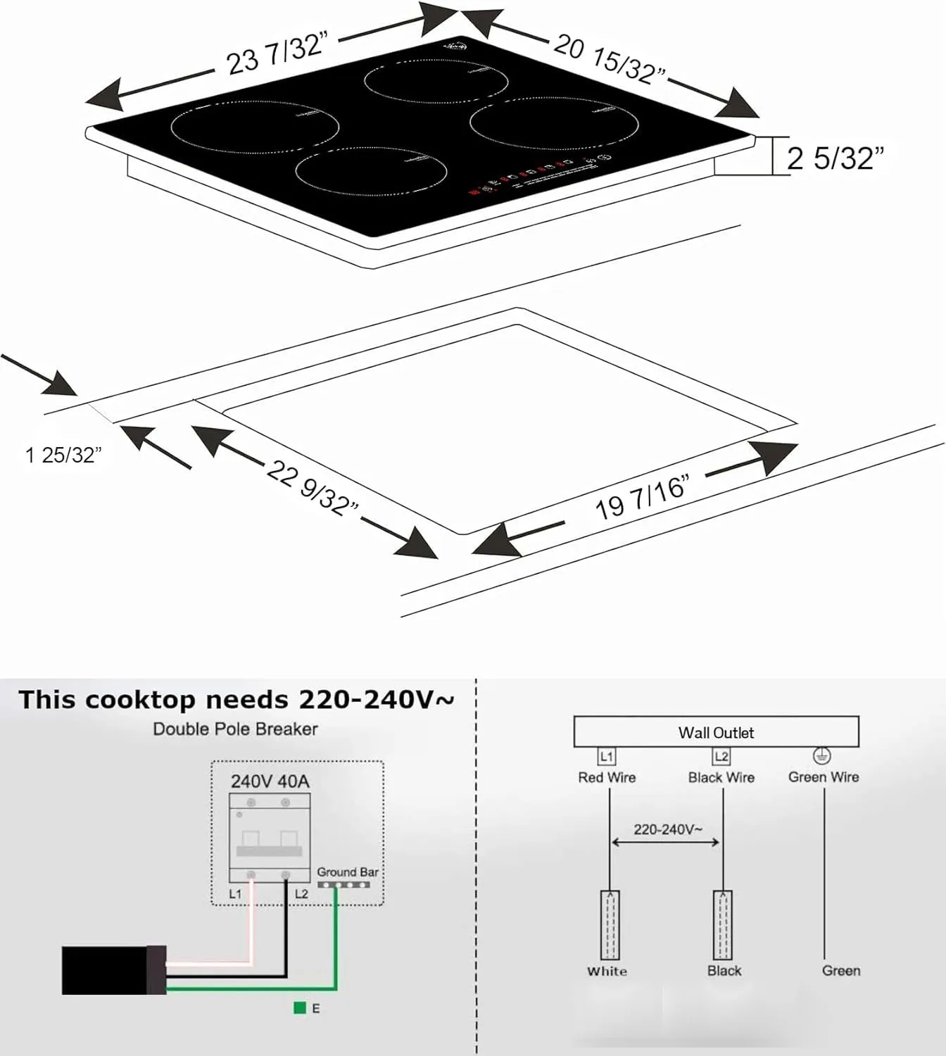 Zone de cuisson 2x 6,9" + 2x 8,9" (min.4,7" jusqu’à 9,5")