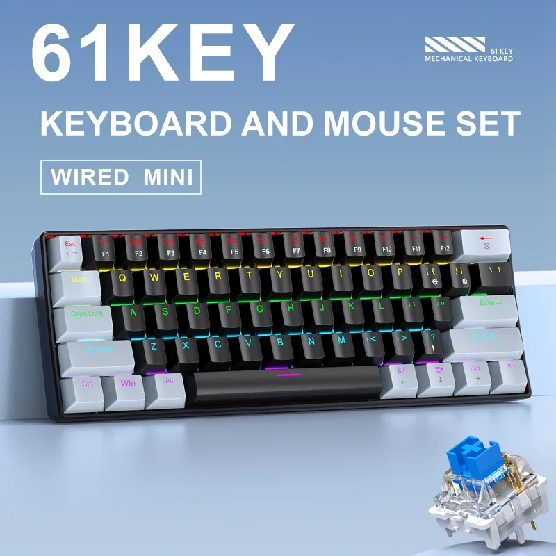 APAYADO K61 Mini clavier mécanique rvb, filaire, 61 touches, noir/blanc, interrupteur rouge/bleu pour les jeux, 60% Portable, PC/ordinateur Portable
