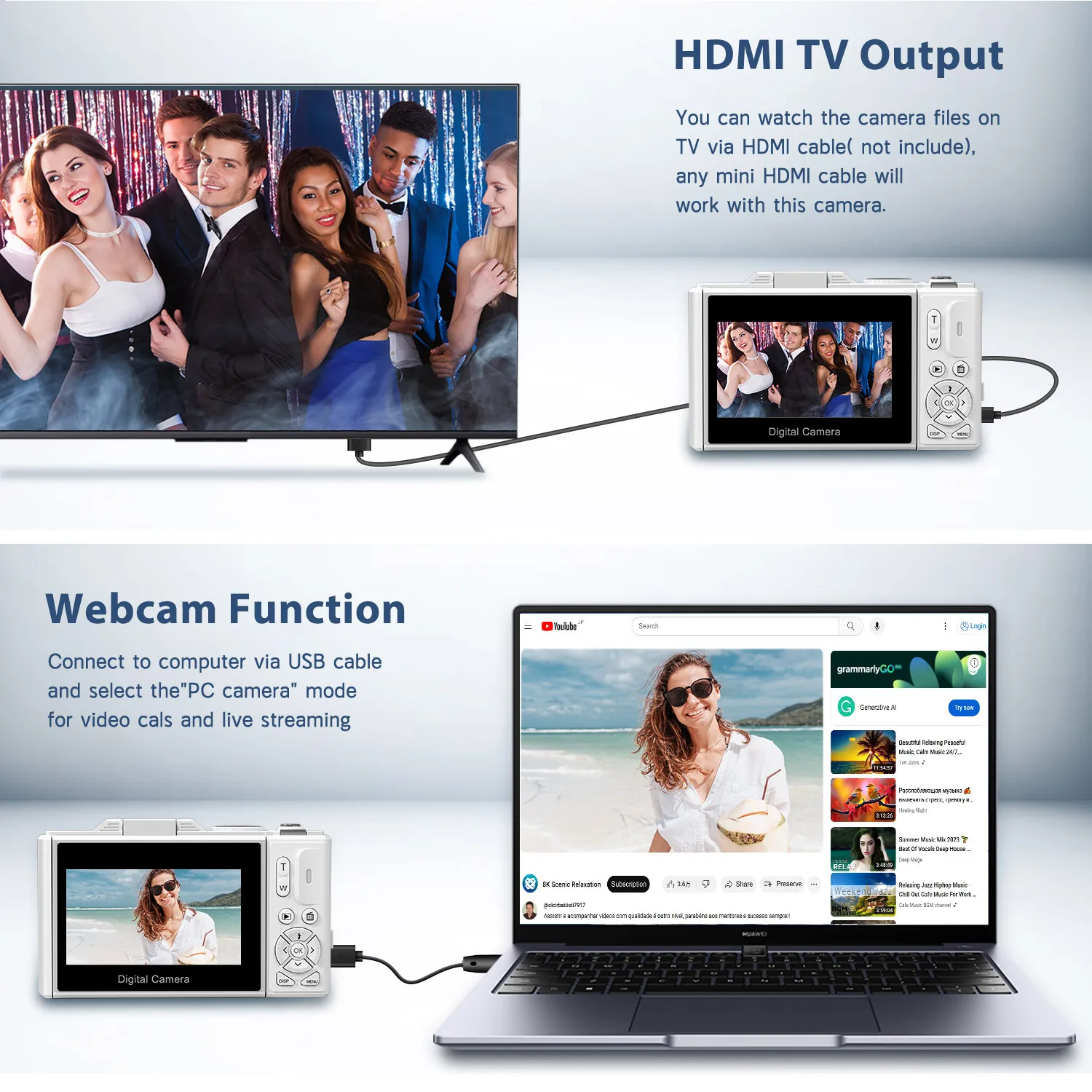 【Webcam et vlogging】En tant que caméra de vlogging rechargeable, elle offre une facilité d’utilisation pour la diffusion en direct et la diffusion sur le Web.En le connectant au PC avec un câble USB, vous permettant de profiter d’appels vidéo sur Skype ou de diffusion en direct sur Tiktok, YouTube, Facebook ou d’autres plateformes de réseaux sociaux.La commodité du chargement USB et du transfert de fichiers, ainsi que la capacité de webcam, le rendent adapté aux appareils photo numériques pour la photographie, le vlogging et le partage de réseaux sociaux.