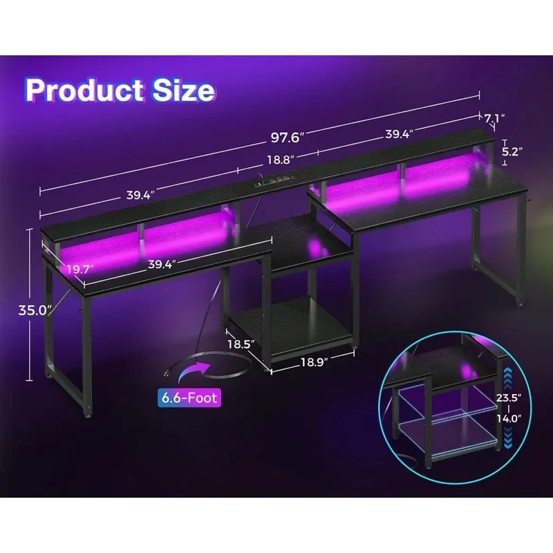 Bureau de jeu double de 98 pouces pour 2, bureau d’ordinateur de bureau à domicile avec étagères de rangement, port de chargement USB et éclairage LED