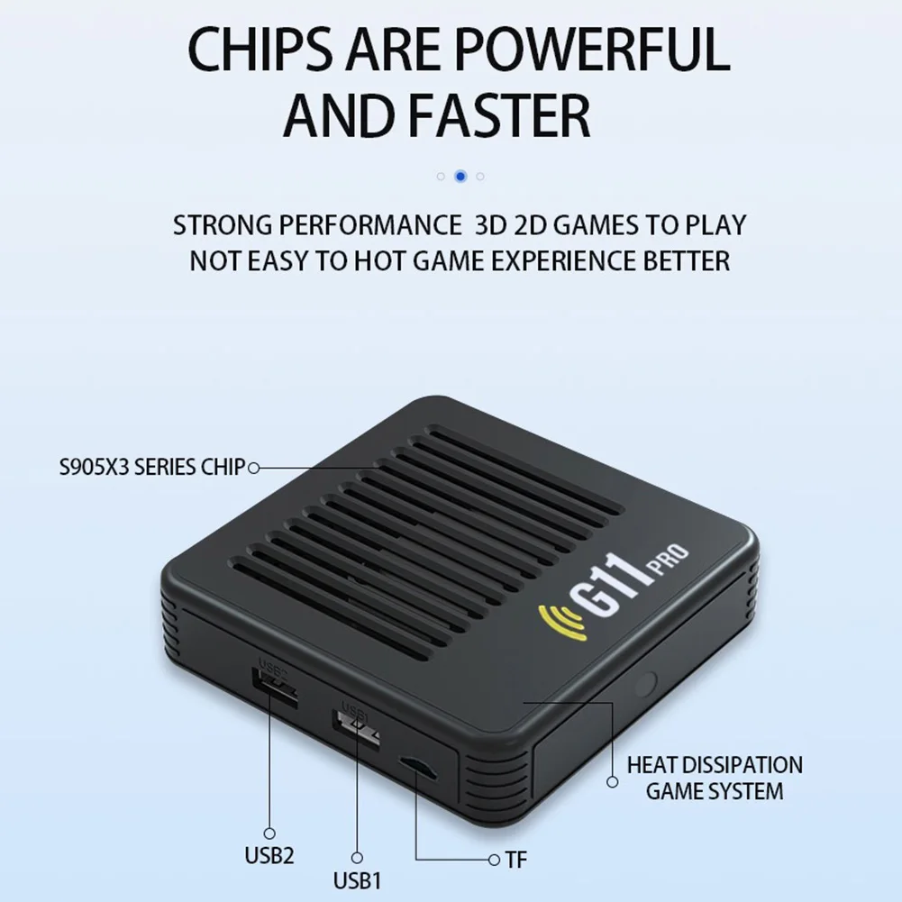 5.Performances de jeu améliorées :Le G11 Pro, alimenté par la puce S905X2, assure un jeu fluide et des temps de chargement rapides.Notre console de jeux vidéo HD permet aux joueurs de rechercher et de personnaliser leurs jeux préférés, ainsi que de les télécharger de nouveaux, avec deux contrôleurs sans fil pour un plaisir de jeu rétro partagé.