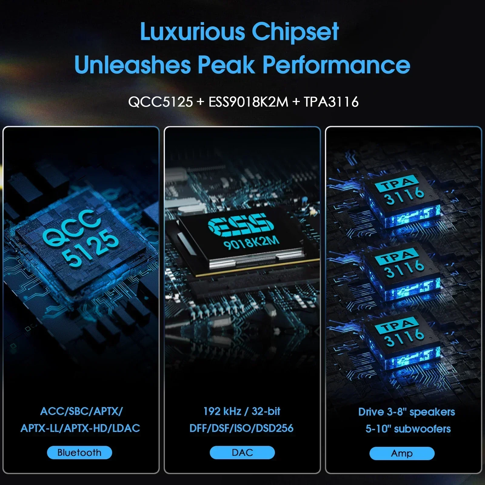 Puces TPA3116, la puissance nominale peut atteindre l’avant (60W × 2), l’entourage (60W × 2), le centre (60W) et le subwoofer (60W), il est facile de piloter des haut-parleurs de 3 à 8 pouces et des subwoofers de 5 à 10 pouces.