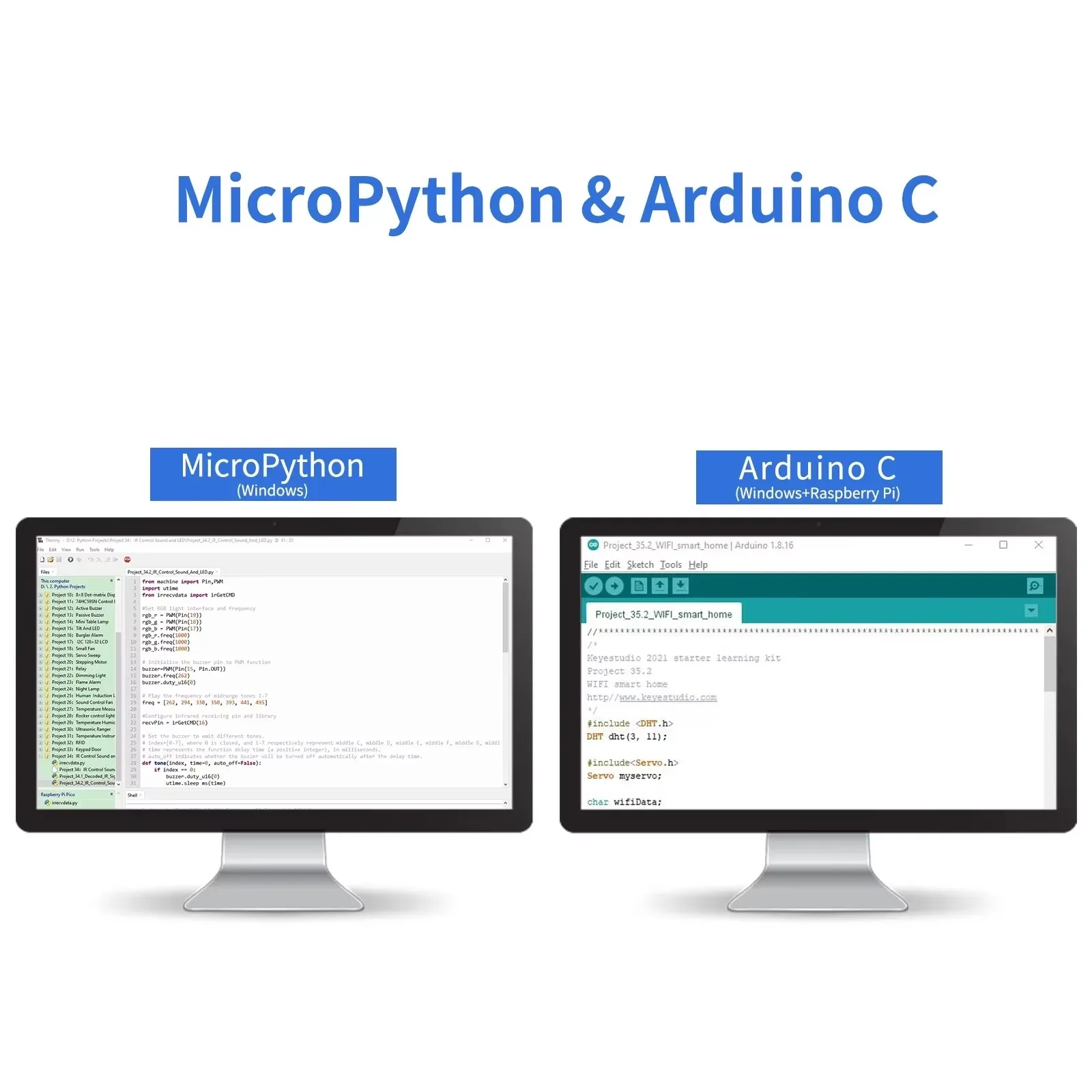 Combien de didacticiels du projet sont fournis, qui contiennent des schémas de câblage détaillés, des connaissances sur les composants et un code de projet fascinant.Chaque projet est produit en utilisant Thonny pour Windows, Arduino IDE pour Windows et Arduino IDE pour Raspberry Pi.C’est facile de commencer.