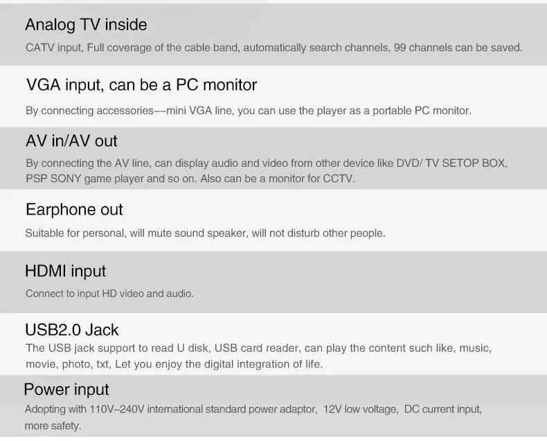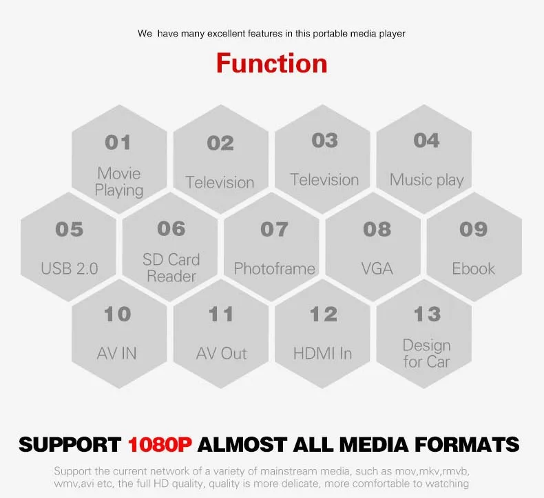 5.With USB jack, TF card slot, play the content of U-flash drive, support 1080P video, MKV, MOV, AVI, WMV, MPEG1-4, MP4, FLV, MP3, video, high birate decode.