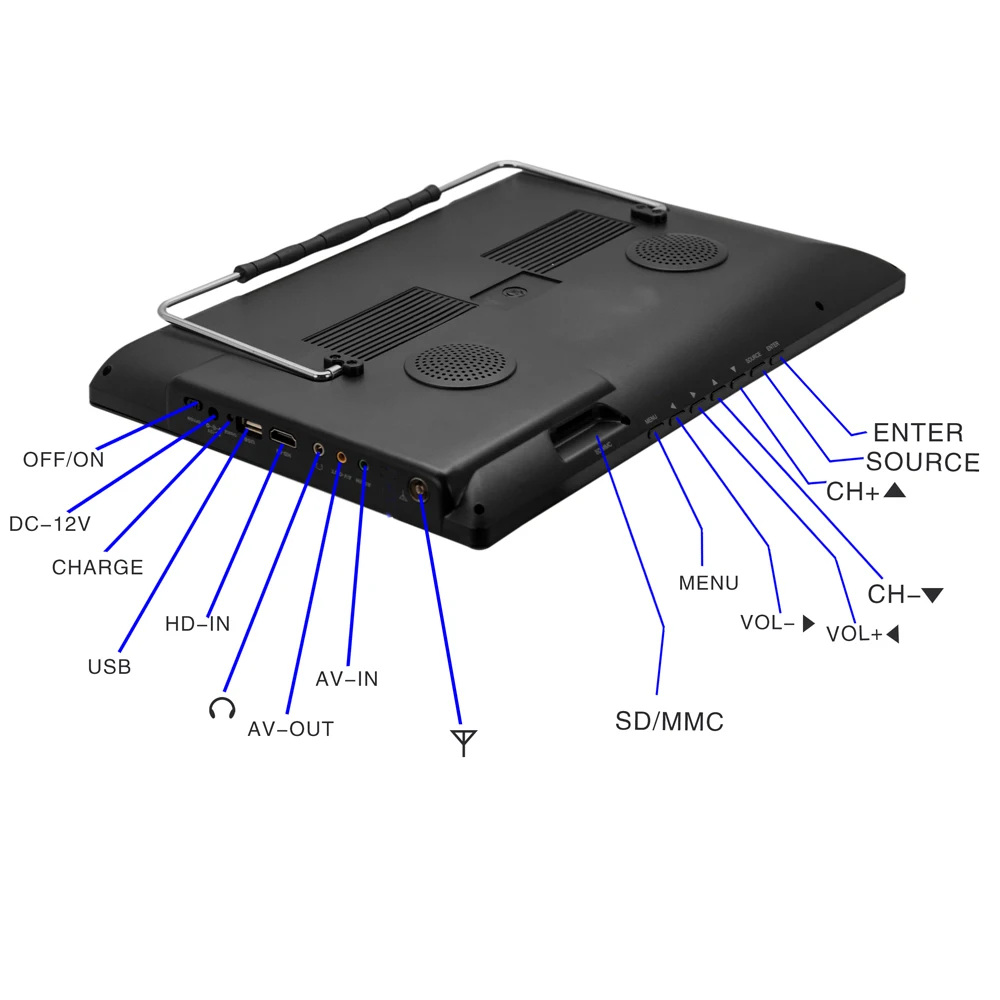 1. Portable digital TV, screen size is 16:09, can watch analog TV, digital TV and ATV.