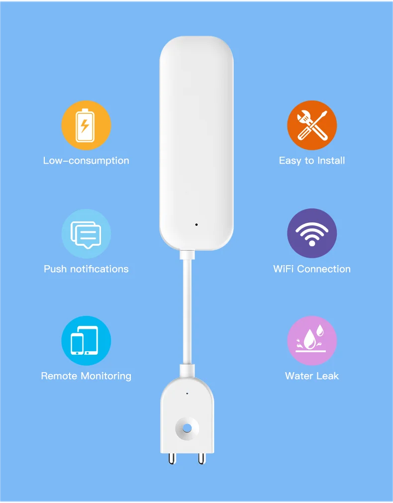 Lorsque les deux pieds du détecteur ont été immergés dans l’eau, les notifications d’alerte seront envoyées sur votre téléphone, soyez conscient du débordement de l’eau à temps, réduisant ainsi le risque d’inondation.