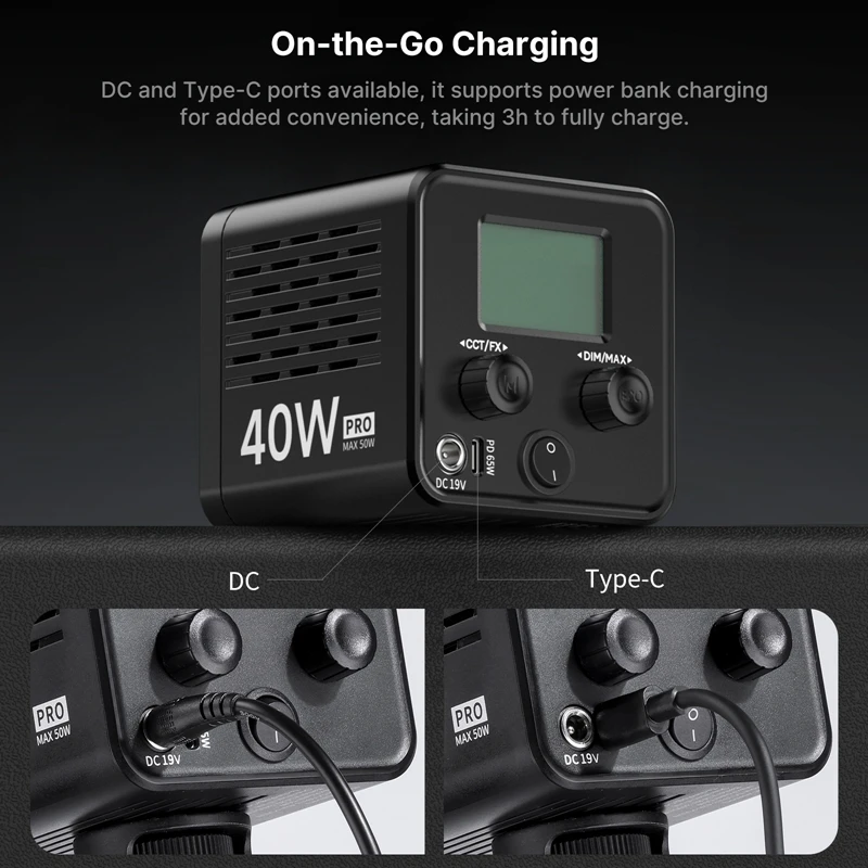 Conseils :Lors du chargement avec le port DC ou le port Type-C lors de l’utilisation, la puissance maximale de la lumière est de 40 W.Veuillez vous assurer que votre chargeur et votre câble de charge prennent en charge le chargement avec PD jusqu’à 65 W..