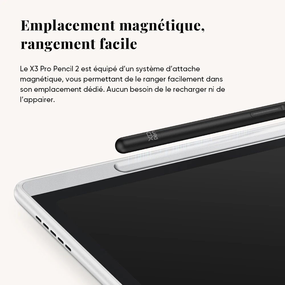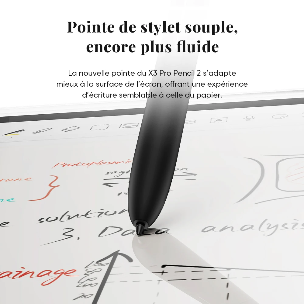 La nouvelle pointe du X3 Pro Pencil 2 s’adapte mieux à la surface de l’écran, offrant une expérience d’écriture semblable à celle du papier.